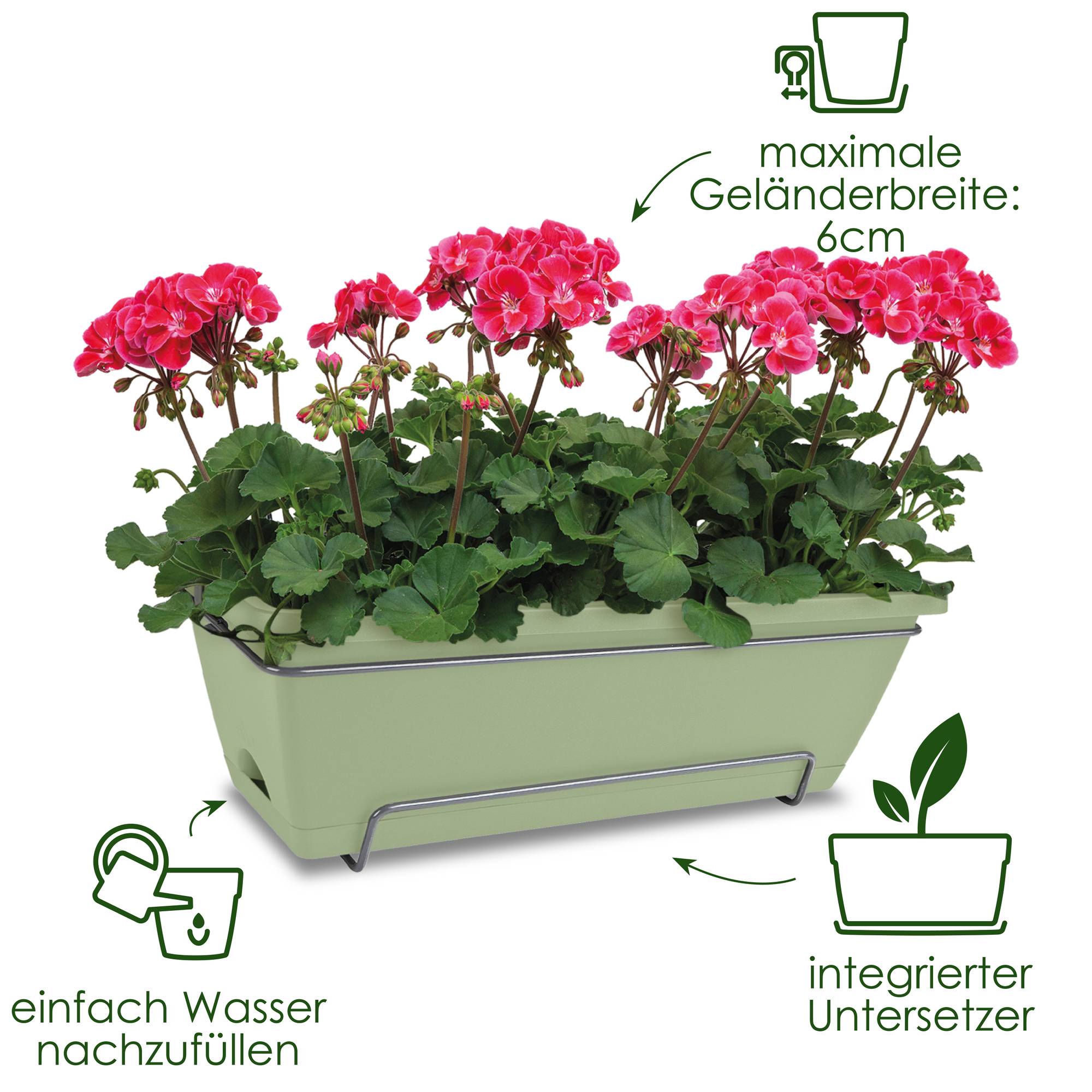 - Der Balkonkasten passt an ein Geländer mit einer Breite von bis zu 6 cm.